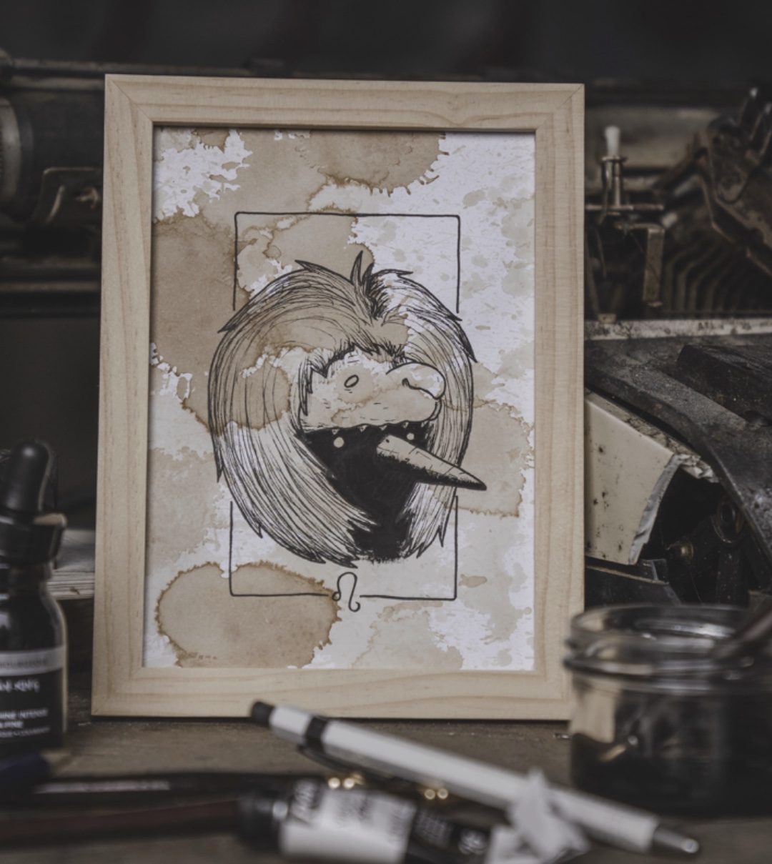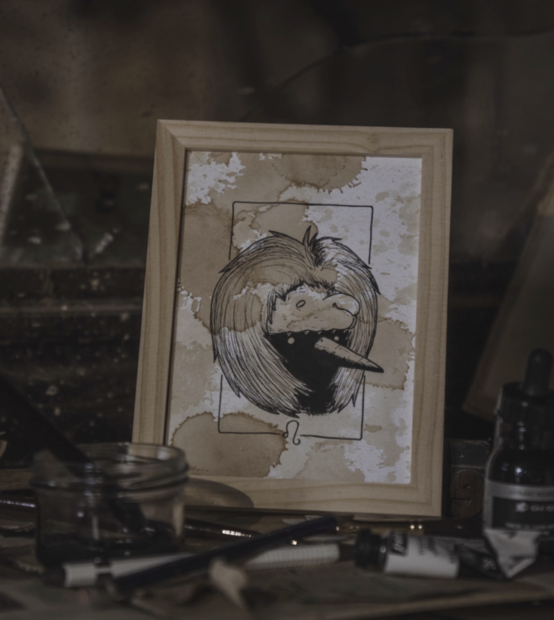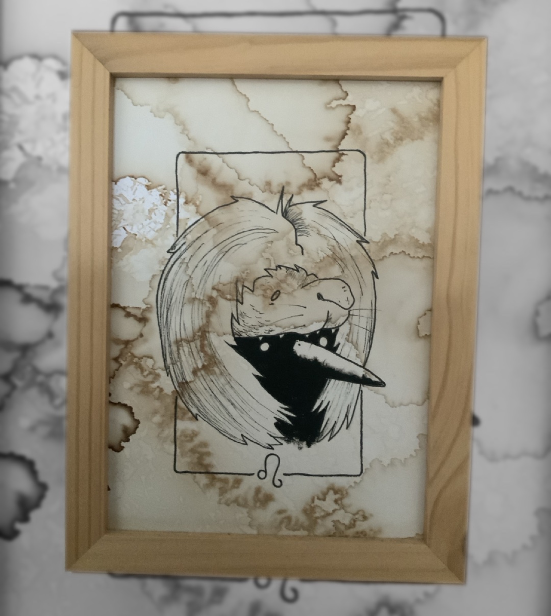 Ce Lion trône sur un fond de café aux nuances dorées et ambrées.